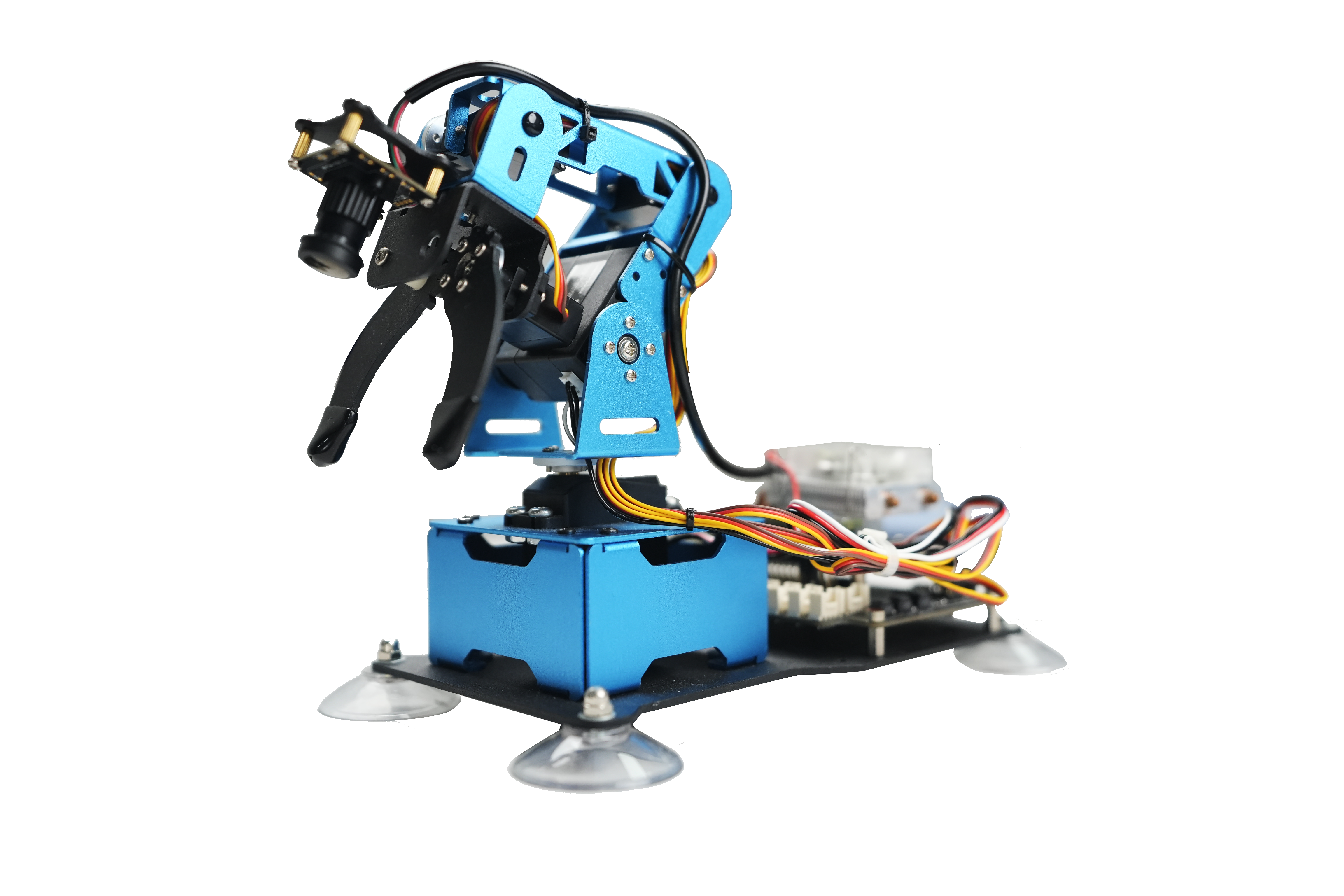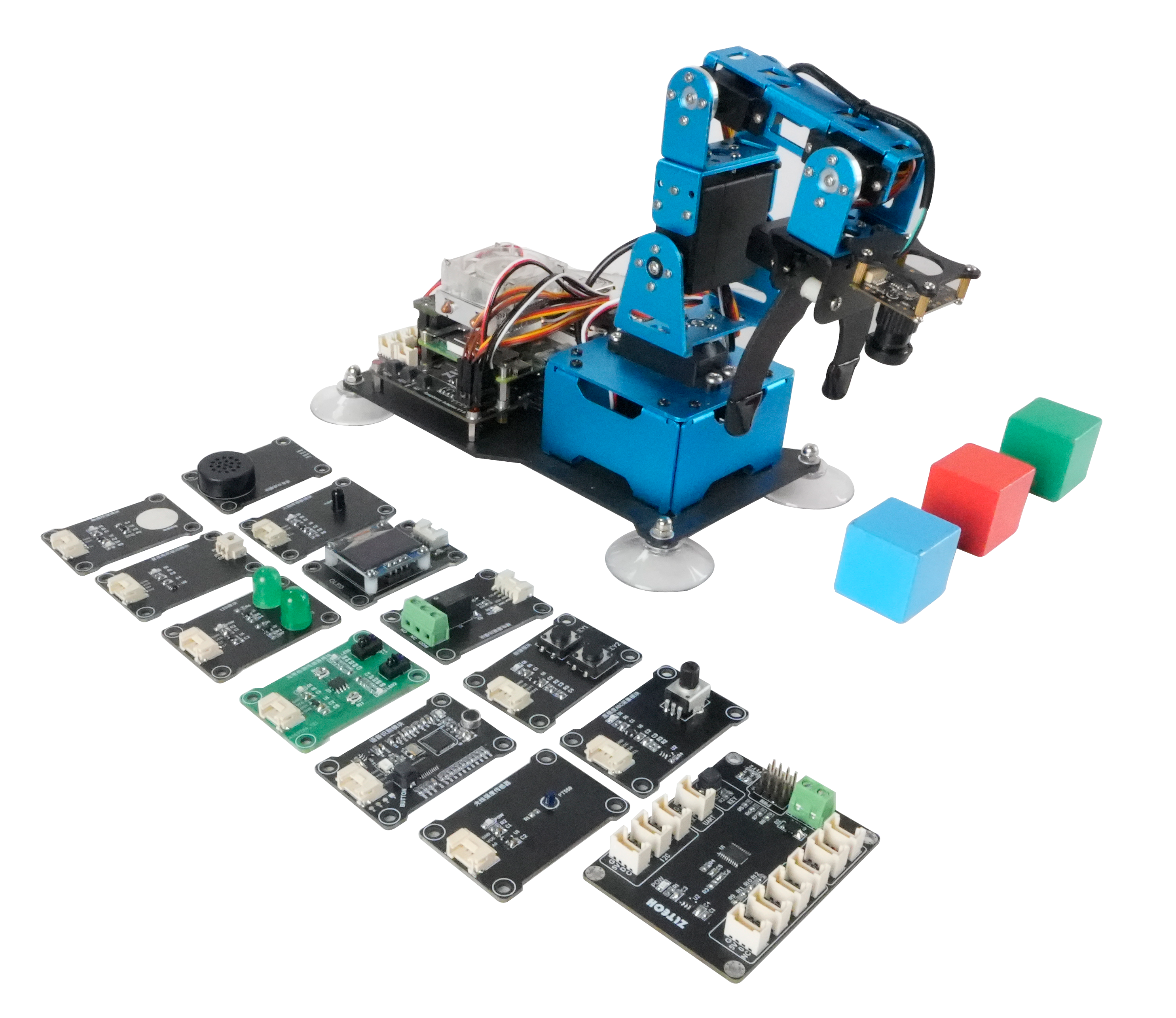 通過構(gòu)建場景與(3)-(7)中AI視覺、AI語音、機器人運動學(xué)、ROS激光雷達(dá)、全系列傳感模塊等相結(jié)構(gòu),實現(xiàn)場景、多傳感器器綜合實驗。例如,a)顏色分揀:通過對目標(biāo)色塊進(jìn)行顏色識別和坐標(biāo)定位,可以輕松控制機械臂實現(xiàn)顏色識別、抓取、分揀。b)智能碼垛:通過對目標(biāo)物品進(jìn)行識別和定位,可以輕松實現(xiàn)色塊碼垛的功能。c)目標(biāo)追蹤:通過對目標(biāo)色塊進(jìn)行視覺定位,利用機械臂的逆運動學(xué)算法,可以更好的對目標(biāo)色塊進(jìn)行捕捉和追蹤。