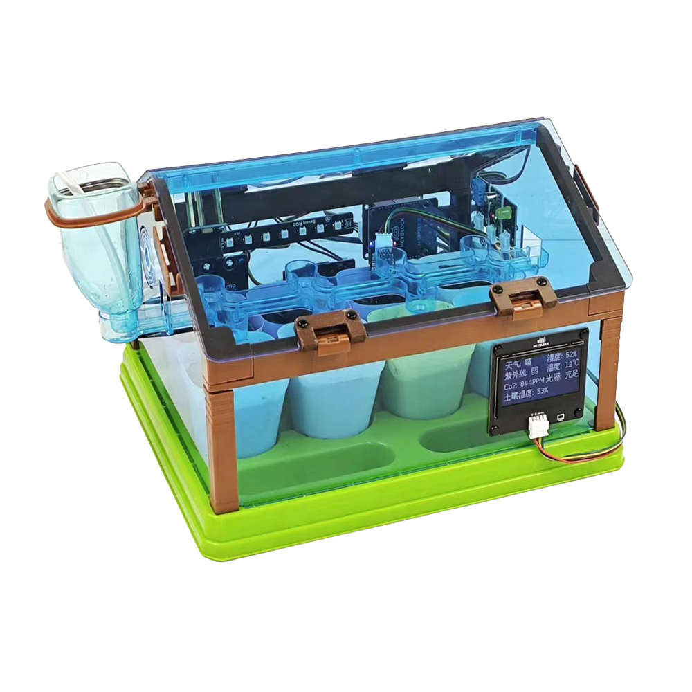 2、AI智慧農(nóng)場(chǎng)可根據(jù)圖形化編程可實(shí)現(xiàn)相應(yīng)的功能:第一,農(nóng)場(chǎng)環(huán)境檢測(cè)功能,包括CO2、土壤濕度、光照強(qiáng)度、溫度、濕度、雨水等環(huán)境參數(shù)監(jiān)測(cè),同時(shí)還能一起將環(huán)境參數(shù)實(shí)時(shí)顯示在2.4寸OLED屏幕上;第二,能根據(jù)土壤濕度檢測(cè)的數(shù)值參數(shù)進(jìn)行自動(dòng)滴灌補(bǔ)水、根據(jù)光照強(qiáng)度進(jìn)行室內(nèi)自動(dòng)不光、根據(jù)室內(nèi)濕度情況進(jìn)行自動(dòng)排風(fēng)等功能;第三,AI智慧農(nóng)場(chǎng)還可利用手機(jī)APP進(jìn)行遠(yuǎn)程交互控制,包括在手機(jī)APP查看當(dāng)前農(nóng)場(chǎng)環(huán)境參數(shù),并利用手機(jī)APP對(duì)農(nóng)場(chǎng)進(jìn)行相應(yīng)的功能控制,包括補(bǔ)光、補(bǔ)水、排風(fēng)等。